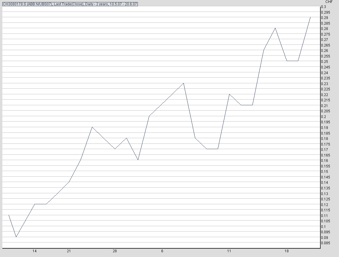 Meiner Meinung nach ist das eine Typische Option, die 1 CHF erreichen kann wenn ABB wirklich auf 30 CHF geht. Der Titel wäre der ABBWA falls es euch interessiert. Bin bei 0.18 eingestiegen