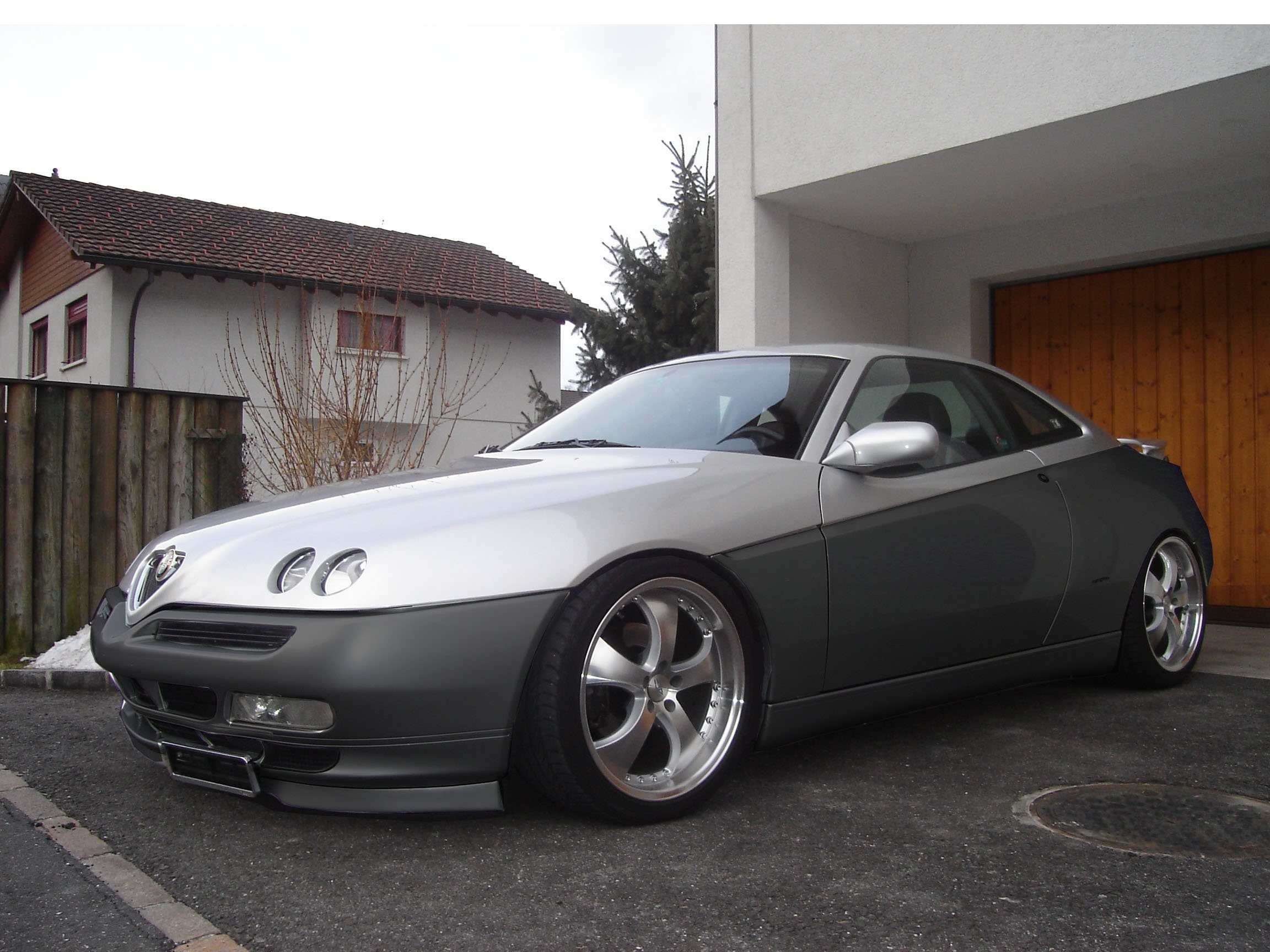 habe mal ein bisschen an meinem gtv mit einem photo bearbeitungsprogramm rumgetüftelt. und da ich jetz wahrscheinlich sowieso ne rundum verspoilerung macha (wahrscheinlich cadamuro) dachte ich mir ich könnte gleich bicolor machen. und das ist dabei rausgekommen. habe ihn mal tiefergelegt und den untere teil grau gemacht.