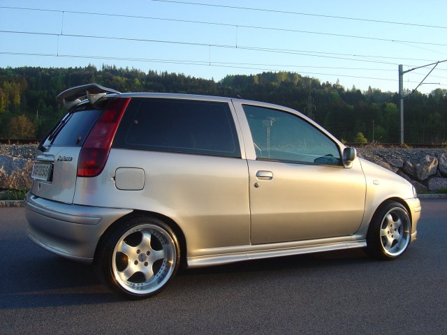 Fiat Punto 75 HSD, Jg. 10.1997, 162‘000km, MFK 27.01.2010, Cadamuro Front- und Heckspoiler, Punto-GT Seitenschweller, getönte Scheiben, Lowtec Federn (original Federn dazu), Silbernes Mittel-Konsolen Cover, Schwarze Angel Eyes Scheinwerfer (originale dazu), zusätzlich zwei Hecklampen, Schwarze Leder Innenausstattung, blaue Fussraumbeleuchtung, Ragazzon DTM ESD mit Beiblatt (original dazu), Sparco Pedalerie, Blaupunkt Santa Cruz CD/MP3 Radio (Subwooferkabel sind eingezogen), 10 Fach CD-Wechsler