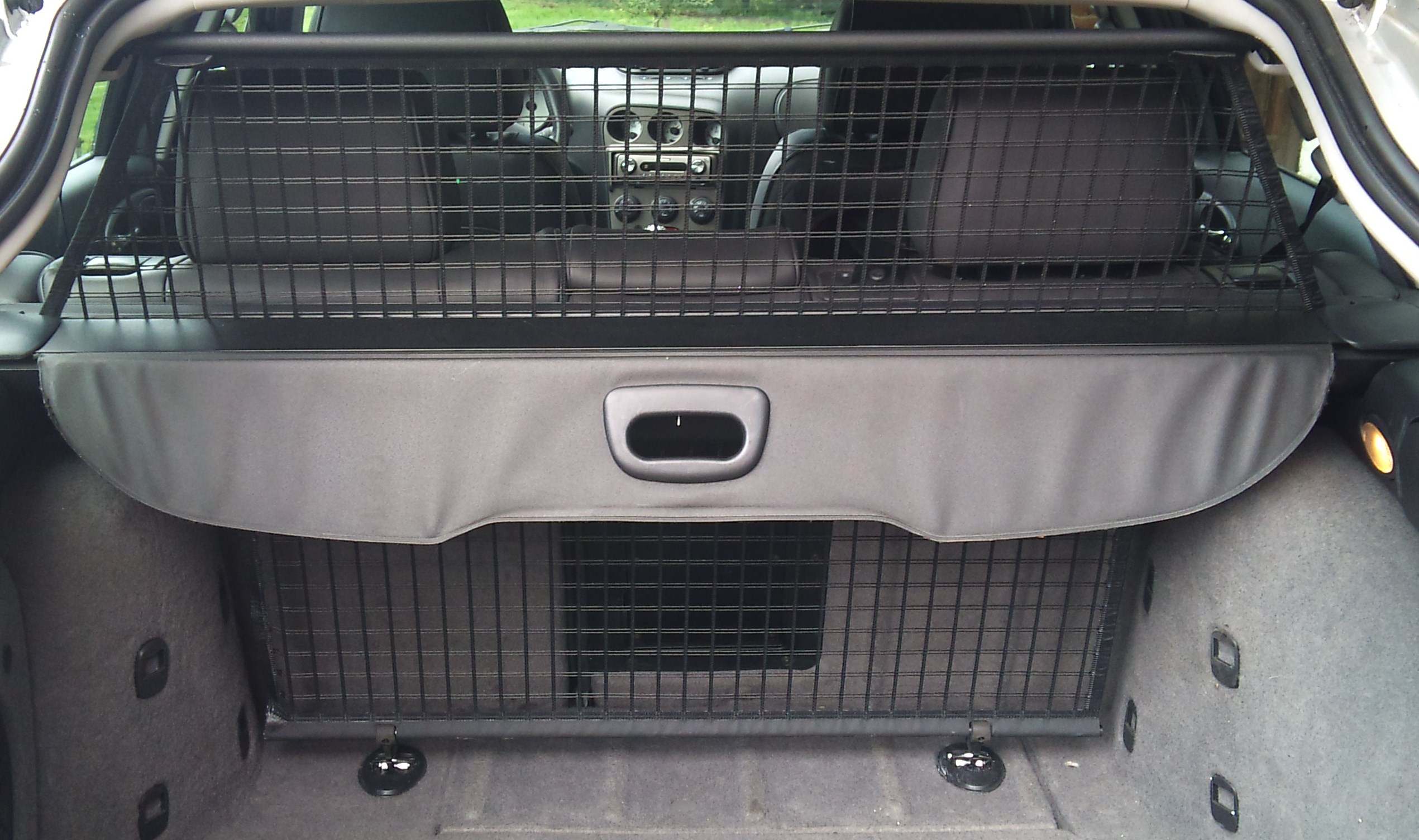 Es kann nach hinten aufgerollt werden und es hat auch noch ein Auffangnetz oben und unten zum ausziehen, wenn man in den Ferien den Kofferraum bis oben füllen muss!