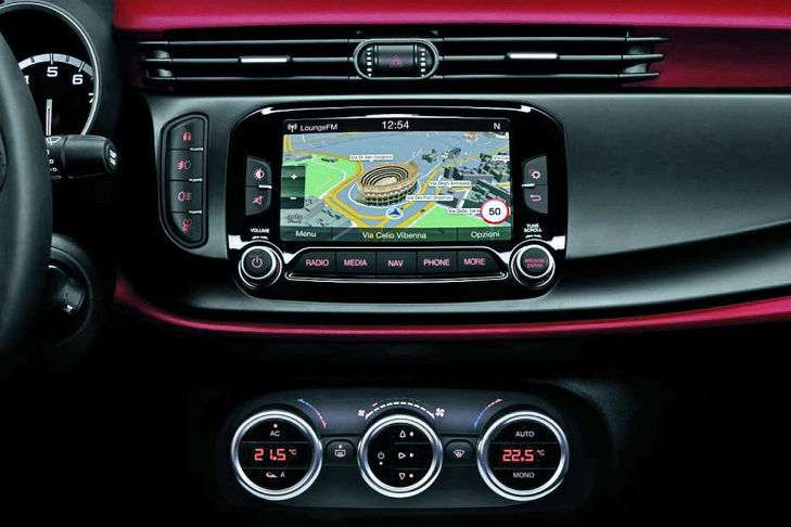 Außen schmückt sich die Italienerin künftig mit einem modifizierten Kühlergrill, Nebelscheinwerfern in Chromeinfassung und frisch gestylten Leichtmetallfelgen in 16, 17 oder 18 Zoll. Außerdem bietet Alfa Romeo drei neue Außenfarben an: Moonlight Pearl, Anodizzato Blue und Bronze. Innen wurde ebenfalls nachgebessert. Insgesamt soll die Einrichtung jetzt hochwertiger sein, neue Ablagen und Staufächer bieten mehr Platz für dies und das. Die Sitze bekommen neue Bezüge und mehr Seitenhalt, das Lenkrad mehr Grip und einen sportlicheren Look. Komplett neu gestaltet wurde der obere Bereich der Mittelkonsole. Hier sitzt künftig das neue, optionale Infotainment-System Uconnect, auf dessen 5,0 oder 6,5 Zoll großem Touchscreen die Giulietta interaktiv, intermedial oder auch sprachgesteuert Unterhaltung und Informationen liefert.