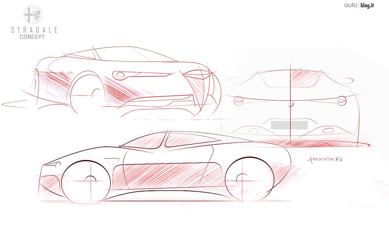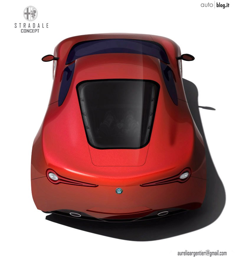 “Ho voluto interpretare una possibile sostituta della 8C basandomi sugli elementi essenziali che contraddistinguono un’ Alfa Romeo, da sempre simbolo di sportività, ma senza elementi estremamente futuristici… così ho pensato ad una vettura con motore posteriore e con le dimensioni da sportiva pura. Lunghezza: 4440cm - Larghezza: 1930 cm - Altezza: 1250, una vettura dal carattere estremamente sportivo ma che si può guidare tutti i giorni nelle strade cittadine; da qui il nome “Stradale”, che riprende sia il concetto che il nome della mitica Alfa 33 stradale dei fine anni 60. Ho lavorato più sulla forma ed il volume della vettura, lasciando delle vaste superfici estese non interrotte da prese d’aria o inserti cromati. Anche lo scudo anteriore è privo della classica cornice e bacchette orizzontali cromate. Stessa cosa per il posteriore, che si ispira per i fanali alla Giulietta, ovviamente in una forma evoluta eliminando la classica forma circolare adottata sulla 8c ma che si ritrova anche sulle Ferrari. A questa vettura ho voluto dare uno stile razionale, con volumi puliti e linee semplici. Per la modellazione della vettura ho usato il software Catia V5 e nello specifico il modulo “Imagine and Shape””